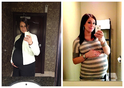 Total weight gain: I have another appt on Friday so we'll find out then. I've been eating really well lately... haven't had much of an appetite so that's helped. BB is encroaching upon my belly-space which has been good for me, calorie-wise. I'll be surprised if I'm up more than a pound or two over the past two weeks but knowing my luck, I'll have gained another 10 or something ridiculous.